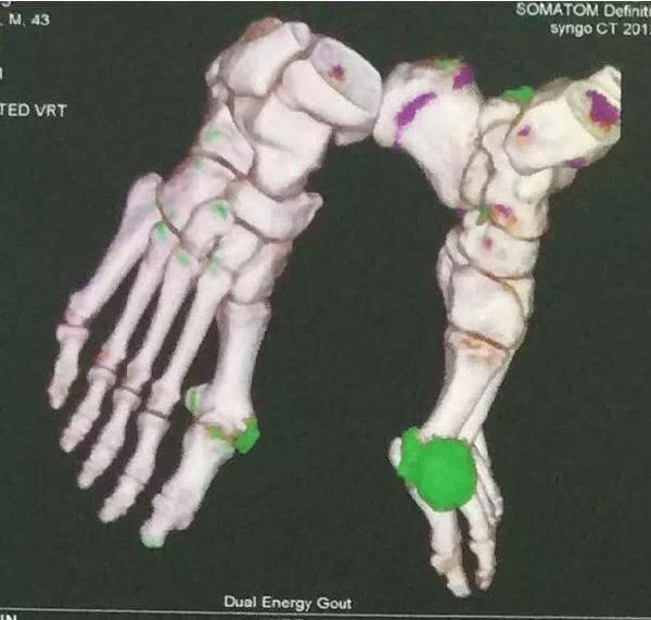 2015年9月,北京大學人民醫(yī)院風濕免疫科張學武教授的門診,來了一位姓劉的患者。額頭上有一塊傷疤,胳膊上有一圈結痂了的牙印兒。這是怎么回事?原來,老劉的痛風關節(jié)炎發(fā)作了,疼的難以忍受。每當痛風發(fā)作,他就撞墻、咬胳膊。這傷就是這么來的。老劉說,痛風疼起來連被單都蓋不上、一陣風從關節(jié)上刮過去都受不了。 提到痛風,大家一定會說是吃出來的。的確,痛風與長期大量進食高嘌呤的飲食密切相關。可是您知道嗎?痛風可不全都是吃出來的。張學武教授說,在他每周的痛風專業(yè)門診當中,就有這樣一部分患者,平時嘴管的很嚴從來都不亂吃,可還是沒能逃過痛風的魔掌。他們的痛風究竟是何因所致?這篇文章將顛覆您對痛風的認識。 【正文】 因素一:運動不合理 運動是把雙刃劍:不運動易痛風,運動過量也痛風 先來說,為什么不運動會造成痛風。張學武教授說,因為適量的運動可以加速新陳代謝,有利于尿酸的排泄。運動量少就容易造成血尿酸代謝不暢,引發(fā)高尿酸血癥。一些慢性疾病,如高血壓、糖尿病、高血脂、肥胖等,也喜歡“盯上”不愛運動的人。而高血壓、高血脂、糖尿病、肥胖、高尿酸血癥都是痛風的高危因素。所以通過適量的運動,不僅血尿酸會適當降低,高血壓、高血脂等痛風的高危因素也會得到改善。 再來說為什么運動過量也會造成痛風。張學武教授說,他近30年的從醫(yī)經(jīng)歷,由于運動過量來就診的痛風患者也不在少數(shù),這其中有一部分是運動員,我們不妨通過運動員的例子,來說明過量運動為什么會造成痛風。 有關運動和尿酸之間關系曾有一項調查研究:一群20到24歲的大學生在運動前及10分鐘激烈運動后,分別抽血檢查血中尿酸值的平均值:以運動前之血清尿酸值為基準,運動一小時后+93.6μmol/l,二小時+113.4μmol/l為最高,三小時+82.8μmol/l逐漸再下降,五小時+76.8μmol/l,七小時+53.4μmol/l漸漸恢復,二十四小時后為-10.8μmol/l,已恢復到運動前的正常值。可見運動后,尿酸有一過性增高,在24小時之后即可恢復正常。 但運動員每天都要做很多的訓練,尿酸值還沒等恢復到正常,又開始第二天的激烈訓練,血尿酸一直處于增高狀態(tài)。而激烈運動還會造成乳酸堆積,乳酸堆積會使血里、尿里的狀態(tài)偏酸。尿酸最容易排泄的PH值是6.5,劇烈運動后體內的尿酸PH值通常小于6.5。 再加上運動員為了維持高強度運動,他們的飲食當中蛋白質和糖類較多,易出現(xiàn)脂類和糖代謝異常,使發(fā)生痛風的危險因素增加。而多數(shù)運動員退役后運動量不如原先那么大,所以造成了體重增長過快,加上吃的又多,關節(jié)在原先的運動當中有過損傷,所以運動員也是痛風的高危人群。 受過損傷的關節(jié)更易患痛風 還有一個重要的原因,就是運動員經(jīng)常受傷。大家都知道,痛風關節(jié)炎的首發(fā)位置通常在第一跖趾關節(jié)(如上圖)。而有一部分人的痛風關節(jié)炎首發(fā)卻不在這個位置,而是在膝關節(jié)、踝關節(jié),甚至是手腕和肘關節(jié)。因為痛風有個特點,有過損傷的關節(jié),更容易發(fā)生或更早發(fā)生痛風。比如有肘關節(jié)炎癥、骨折史,崴了腳等。足球運動員總用腳趾踢球,所以痛風好發(fā)于腳趾關節(jié)。這樣的關節(jié),它的結構發(fā)生了變化,尿酸更容易往這樣的關節(jié)上沉積,就像血管里有一些斑塊之后就容易發(fā)生血栓。正常男性的血尿酸值是428μmol/l,很多尿酸高的人可能在600μmol/l才開始發(fā)作痛風關節(jié)炎。而一旦有關節(jié)損傷,也許500μmol/l痛風關節(jié)炎就會發(fā)作。 張學武教授說,除了崴腳之外,使勁揉、按摩關節(jié)、蒸桑拿,關節(jié)局部的尿酸鹽就容易快速析出,痛風就容易發(fā)作。如果您的尿酸高,又有關節(jié)損傷,更應關注自己的血尿酸水平,每半年檢查一次血尿酸,并注意不要發(fā)生關節(jié)損傷。 關節(jié)不負重的運動方式最適合痛風患者 張學武教授說,痛風患者的運動原則是保護關節(jié)。應該選擇關節(jié)不負重的運動方式,比如游泳、散步、跳舞、騎車。需要提醒您的是,再好的運動也要適量。曾經(jīng)有位男性痛風患者,是個老板。得了痛風之后治病心切,特別在意自己的病,飲食上很注意控制。他聽說游泳是痛風患者的最佳運動方式,就連續(xù)游了5個小時。沒想到他痛風又發(fā)作了,一個星期沒能下來床,腳腫了三號,疼痛難忍,生意也都給耽誤了。 區(qū)分痛風和其他關節(jié)炎的簡便辦法 出現(xiàn)關節(jié)疼痛的時候,如何區(qū)分是痛風關節(jié)炎還是其他關節(jié)炎導致?張學武教授說,痛風常常是單關節(jié)的紅腫熱痛,疼痛往往只在一側。而其他關節(jié)炎如類風濕關節(jié)炎,通常是雙側關節(jié)呈對稱樣疼痛。 再就是到醫(yī)院通過一些輔助檢查手段,也可以準確判斷是不是痛風關節(jié)炎。如B超。痛風關節(jié)炎通常在B超下顯現(xiàn)出“雙軌征”,就是在關節(jié)軟骨的上面和下面分別有兩條亮線。而別的關節(jié)炎則沒有這種特征。還有一種輔助檢查手段是通過雙源CT來看關節(jié)。雙源CT通過顏色的變化,能顯示出關節(jié)中存在的尿酸鹽結晶。痛風關節(jié)炎通常會在檢查中看到綠色的東西,這就是過多的尿酸鹽結晶。而其他關節(jié)炎,如類風濕關節(jié)炎,則顏色偏紅。