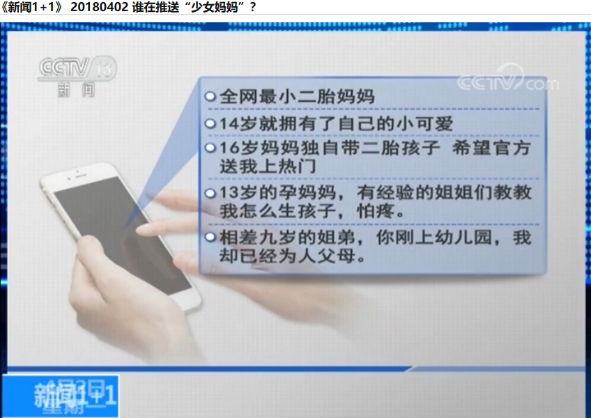 繼今日頭條虛假廣告被央視點名之后,快手和火山小視頻也登上了央視大舞臺,還是兩次。 3月31日,央視《新聞直播間》和《東方時空》對短視頻平臺上存在的大量未成年孕婦現(xiàn)象做了報道,提到在快手、火山小視頻找出了數(shù)以百計的未成年媽媽視頻,并追問短視頻的底線在哪里? 4月2日,白巖松主持的《新聞1+1》再次點名快手、火山小視頻的網(wǎng)絡視頻中,充斥著大量以“未成年少女做媽媽”、“全網(wǎng)最小二胎媽媽”為內容的視頻,這些視頻還會被標注“官方推送”的字樣,不僅是對倫理道德的無視,甚至觸碰到了法律。
