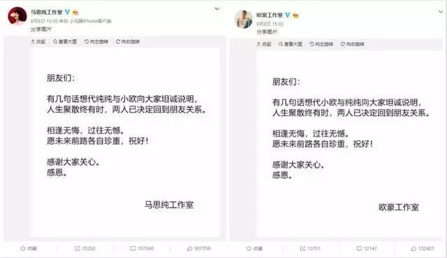 感情本是私人的事情,不管明星們到底是不是和平分手,沒必要廣而告之。但作為公眾人物出于對粉絲負責的態(tài)度,通知一聲;分手好聚好散,不撕不罵,也不失為一種成熟的感情處理方式!