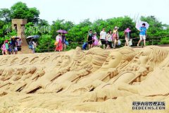 游客欣賞沙雕作品。 本報(bào)記者楊寬攝 水與沙,靜與動(dòng)。 清澈的水歡快靈動(dòng),它的故事奔放熱烈;金色的沙靜謐深沉,它的故事源遠(yuǎn)流長(zhǎng)。 走進(jìn)金沙灣沙雕大世界,盡是水與沙的壯美奇...
